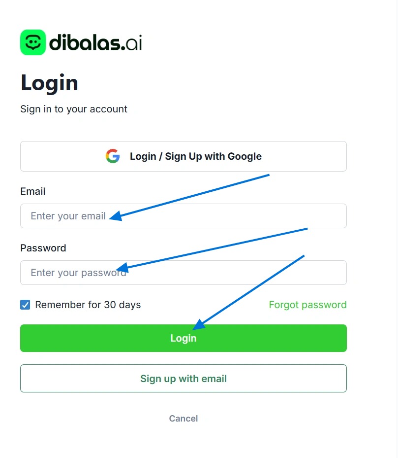 Here are two ways to log in to Dibalas.ai.