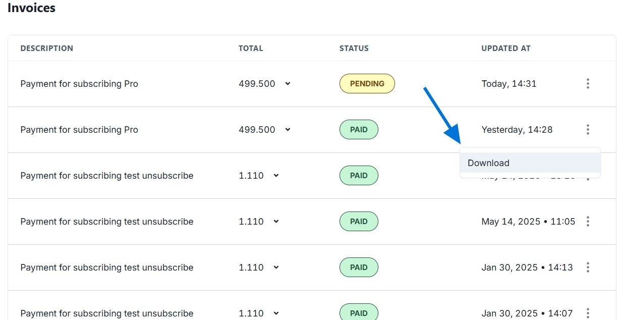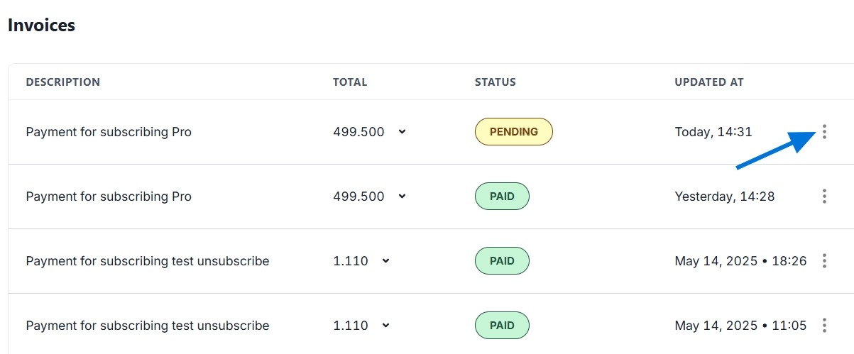 - You can download the invoice for payments that have been successfully completed or have a 'Paid' status. Tap the three dots on the right side.