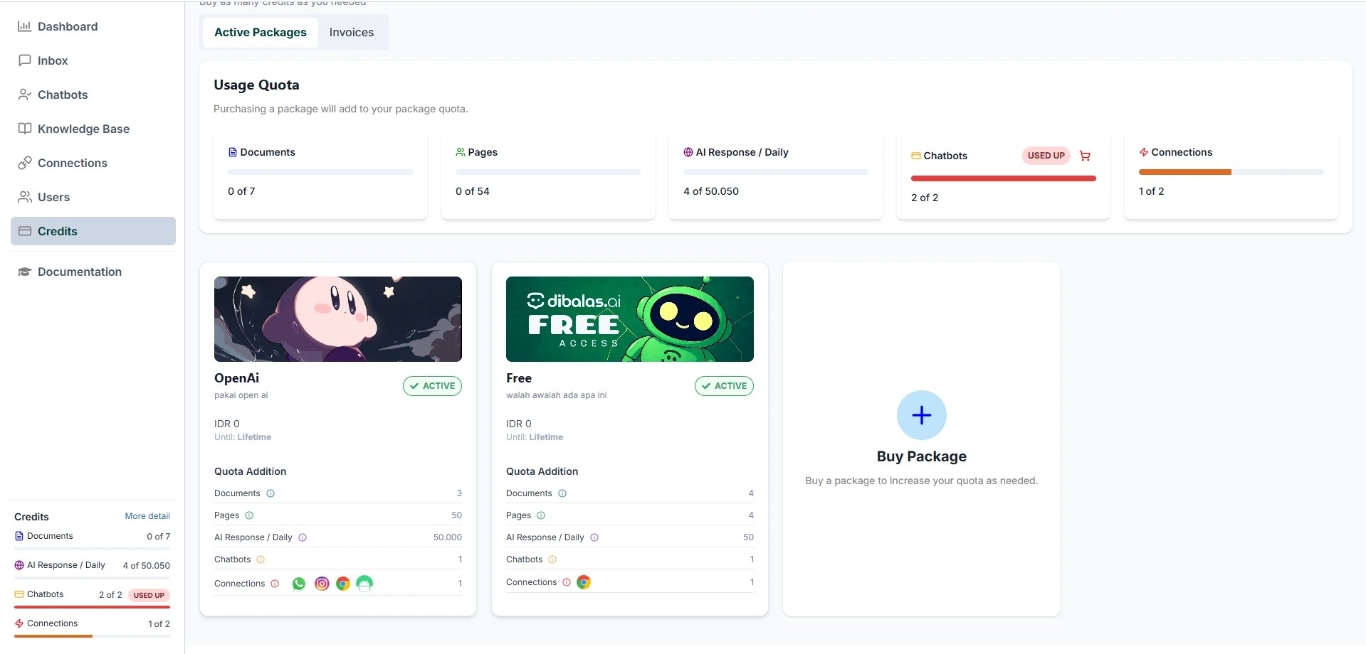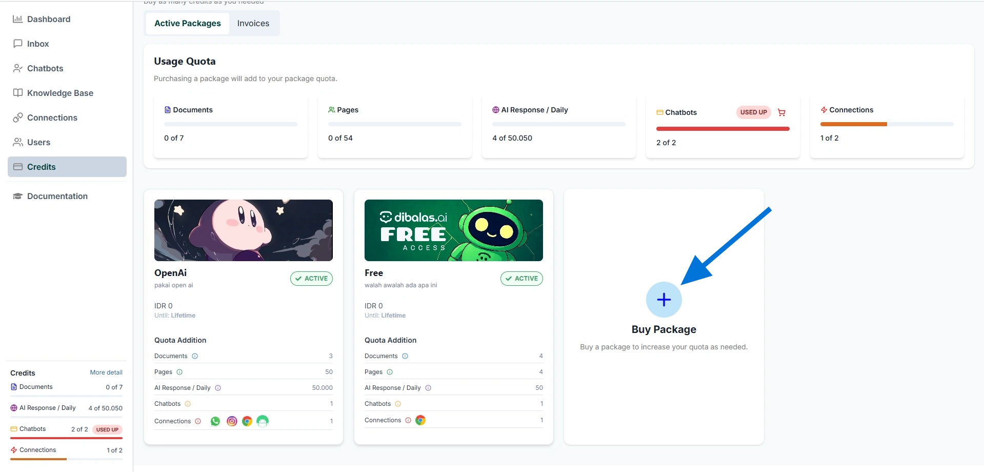 - This is the credits page, you will have 1 free package.