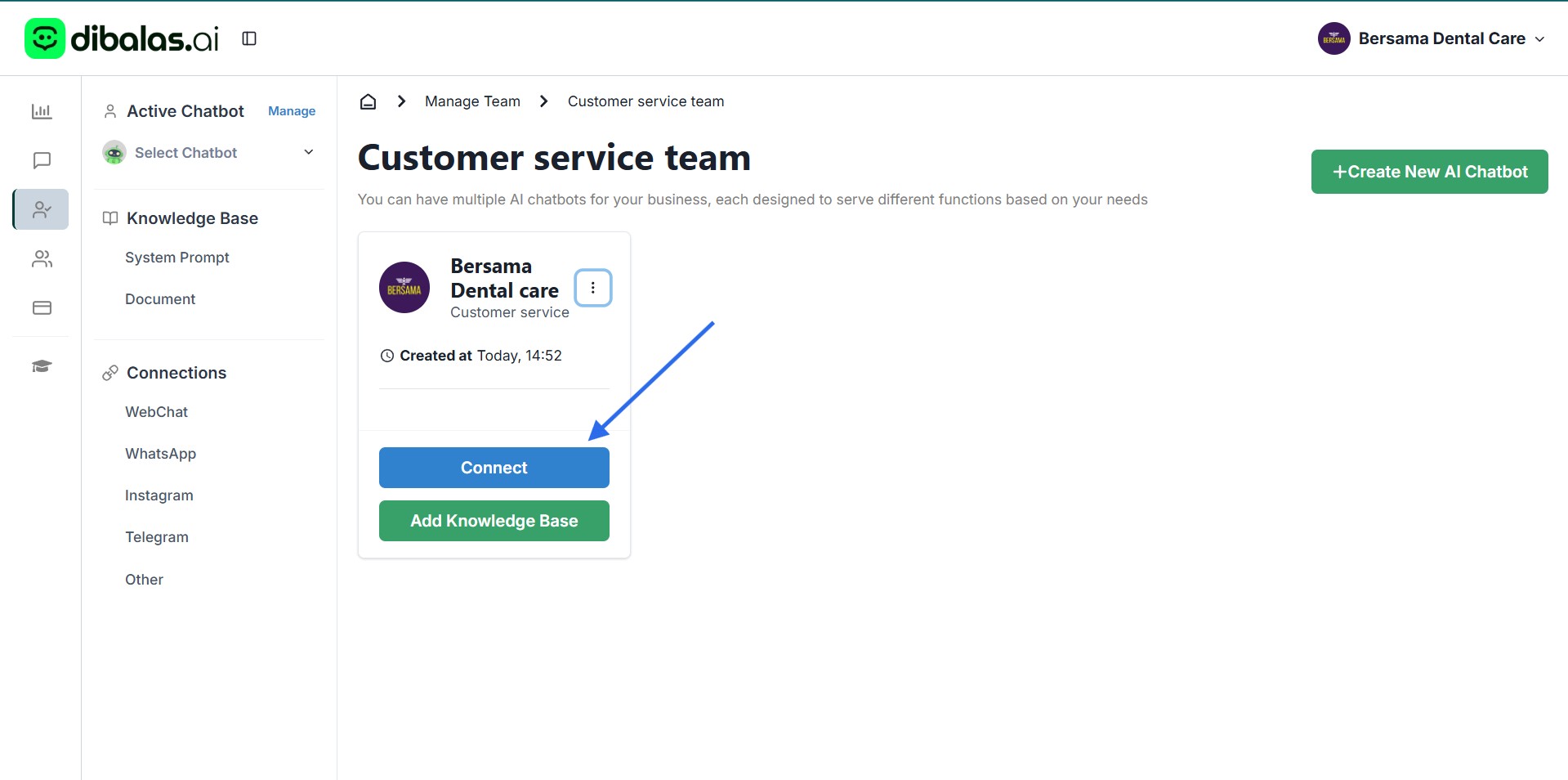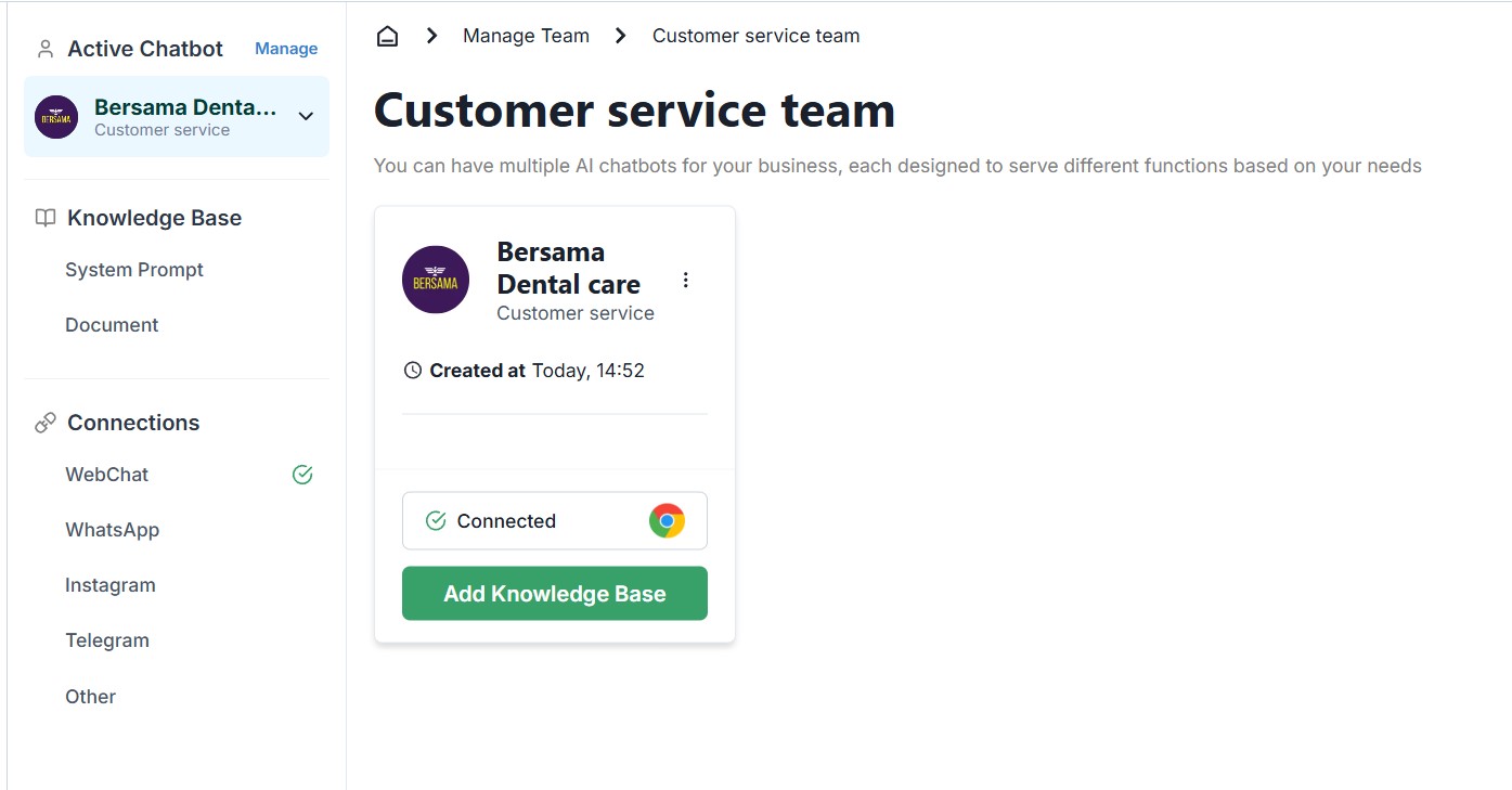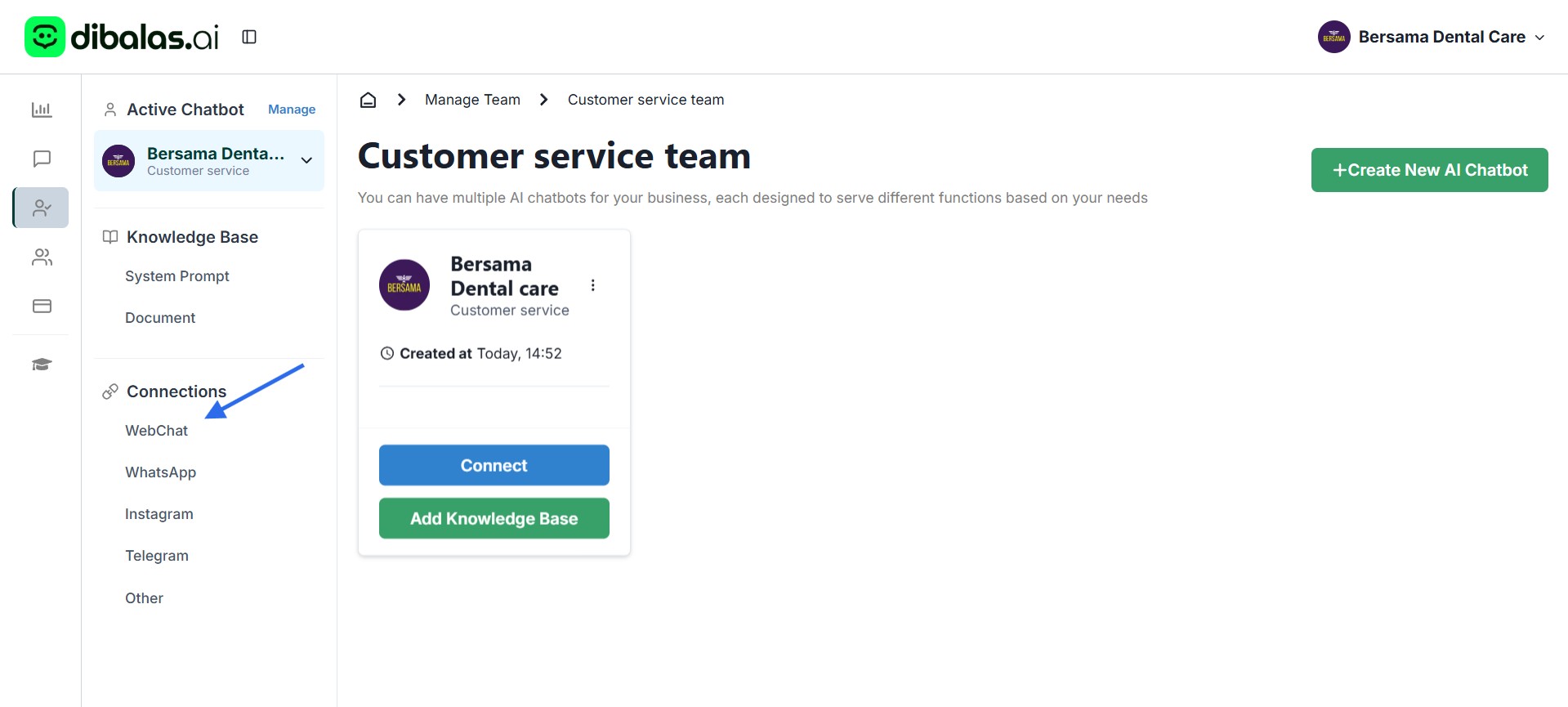 You can view the connections linked to your chatbot on the Chatbots page.
