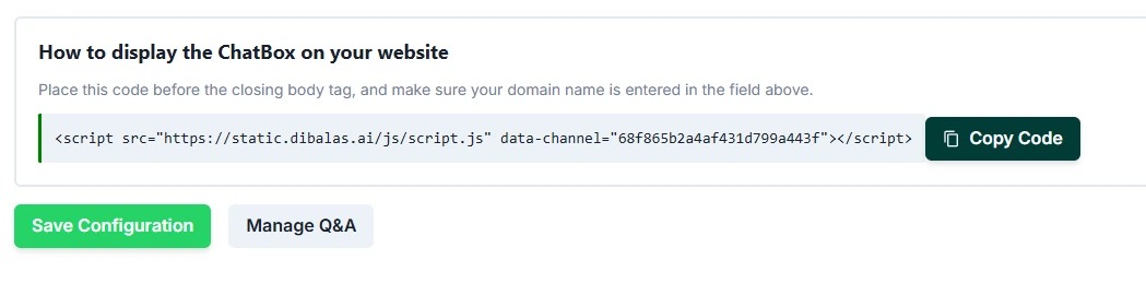 In this tab, you can integrate your website with dibalas.ai, allowing the live chat feature from dibalas.ai to appear on your business website.
