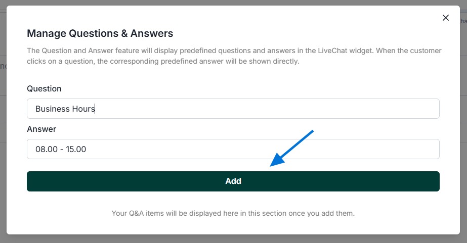 You can also add a list of questions and answers (Q&A) that will appear in the live chat.