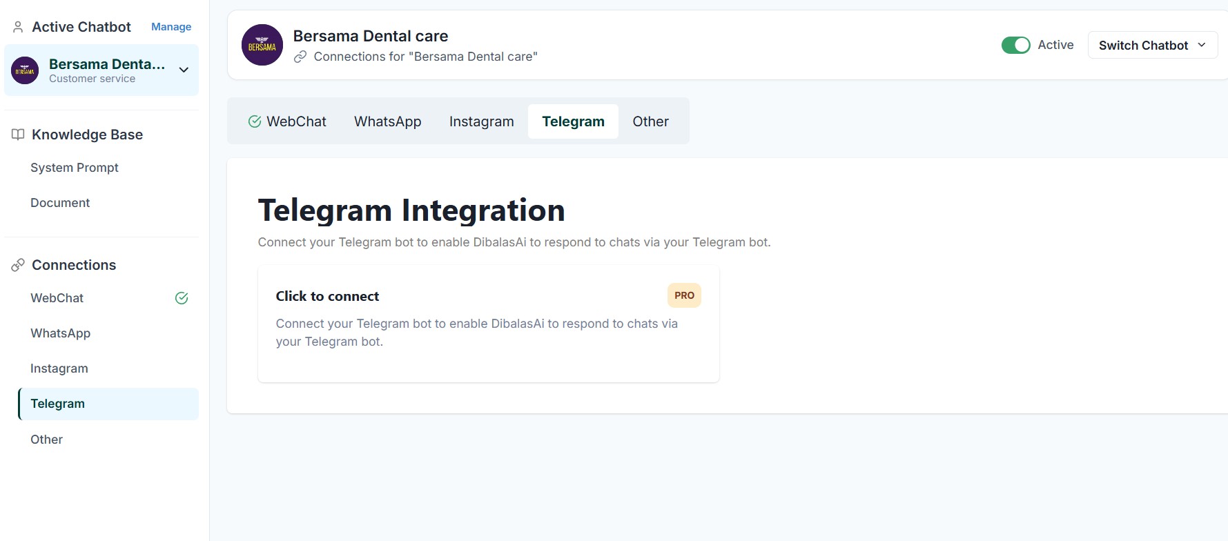 You can link your Telegram bot to activate DibalasAi, allowing it to respond to chats via your Telegram bot. How to get Telegram Bot Token: