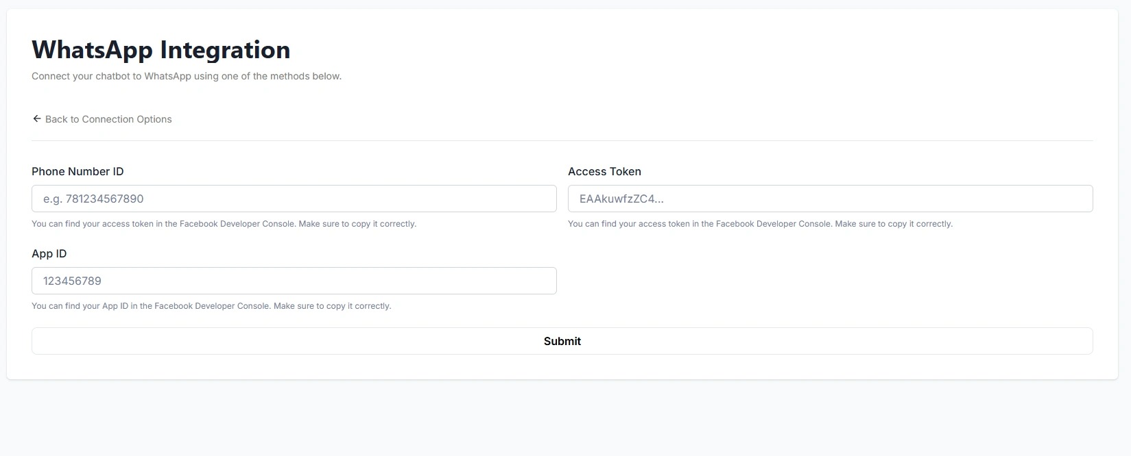 Enter your Phone Number ID, Access Token, and App ID, which you can obtain from your Meta Business account.