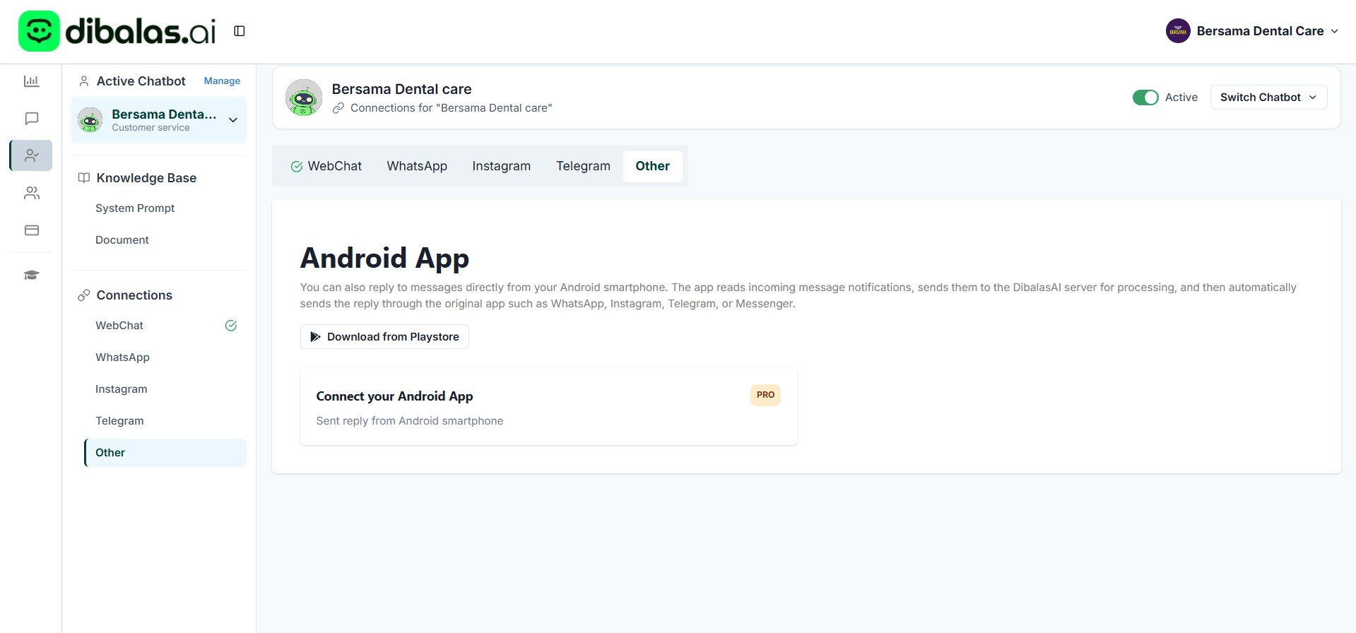 Tap “Enable Android App” to start using your chatbot through the Dibalas.ai app on your Android phone.