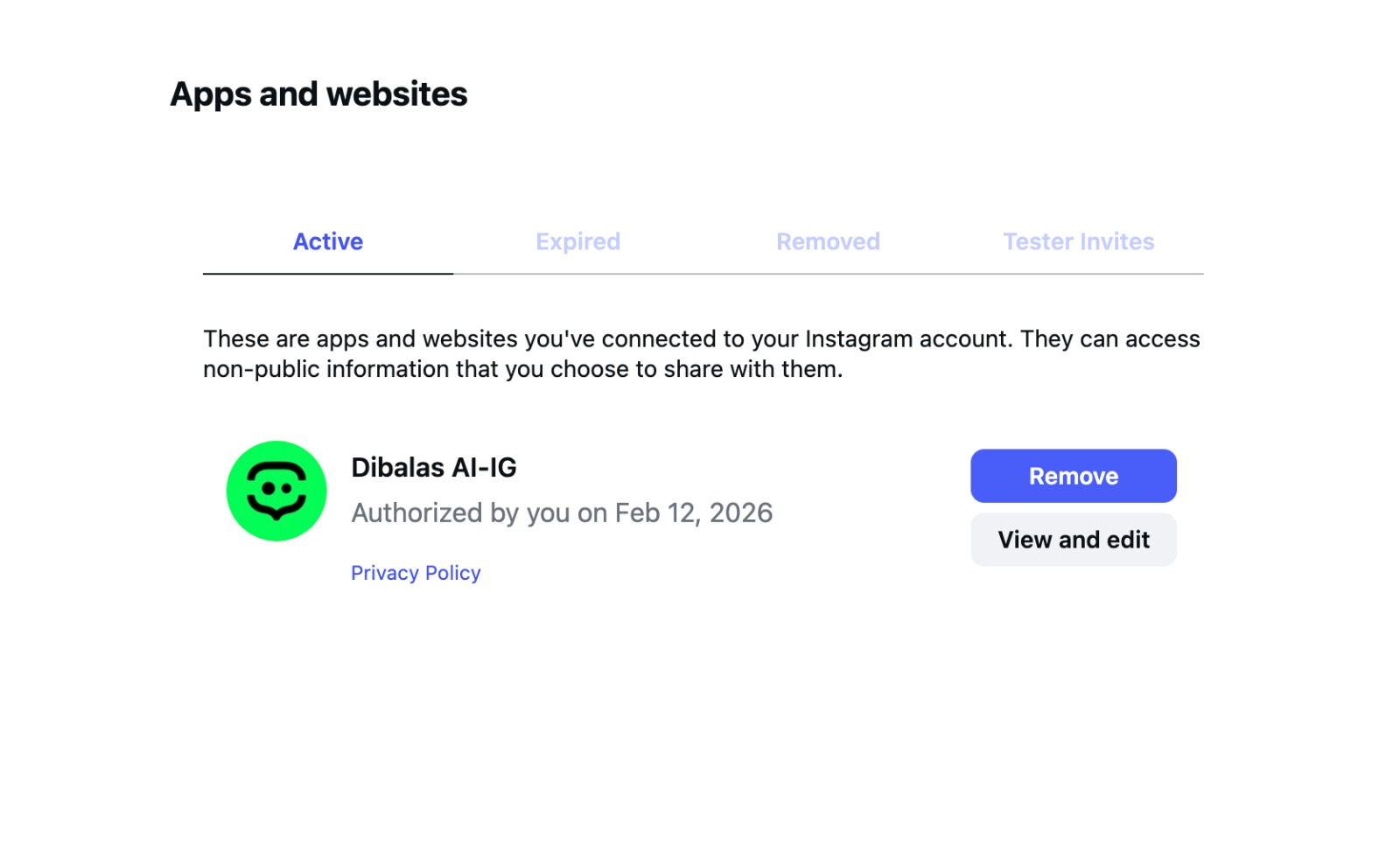 However, if you remove the connection from the DibalasAI dashboard, the connection on Instagram will not be automatically removed. You will still need to remove it manually through the Instagram Settings page.