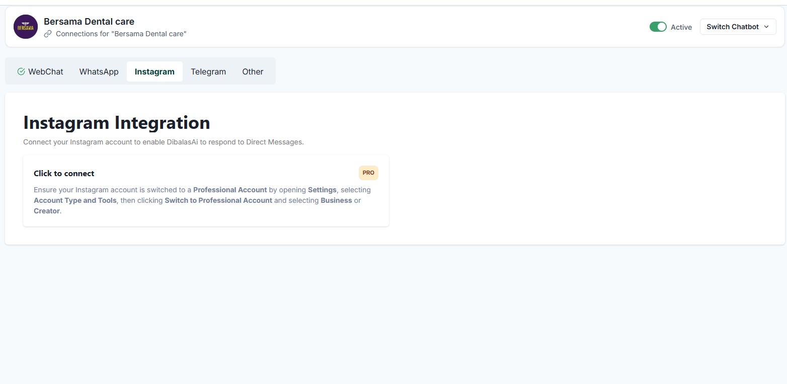 Make sure your Instagram account has been switched to a professional account before connecting it to dibalas.ai. Additionally, ensure that the Instagram account has never been connected to dibalas.ai before. Please note that one Instagram account can only be connected to one chatbot.