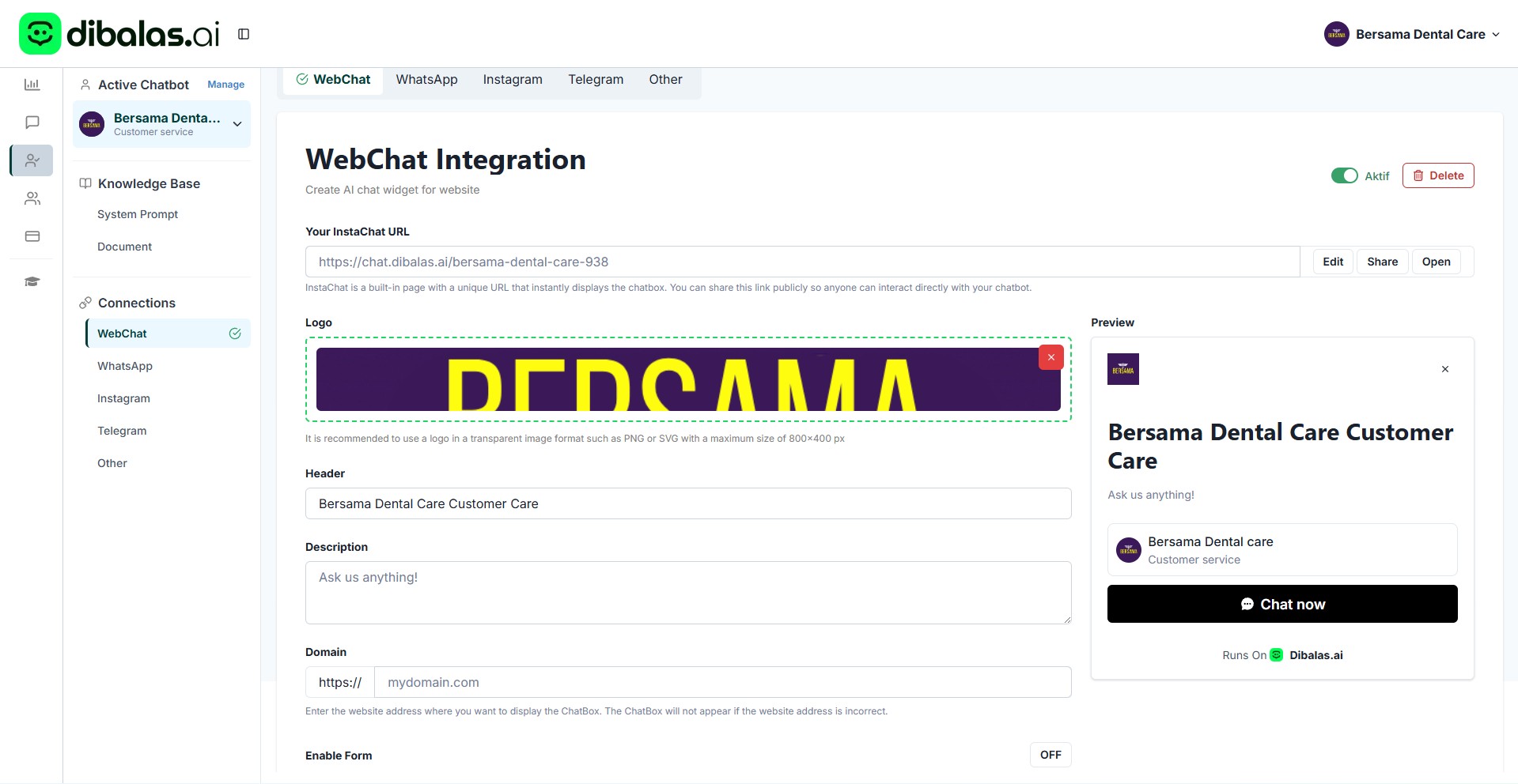 In this tab, you can integrate your website with dibalas.ai, allowing the live chat feature from dibalas.ai to appear on your business website.