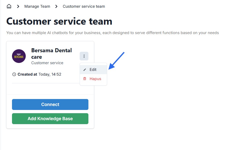 - Below is the display you will see after successfully adding a new chatbot.