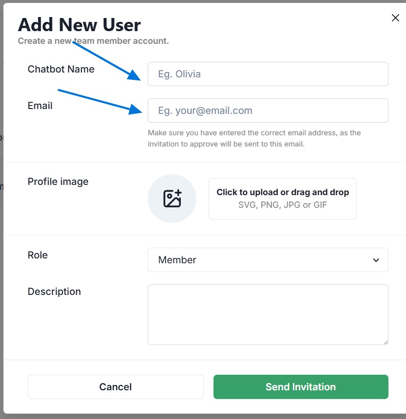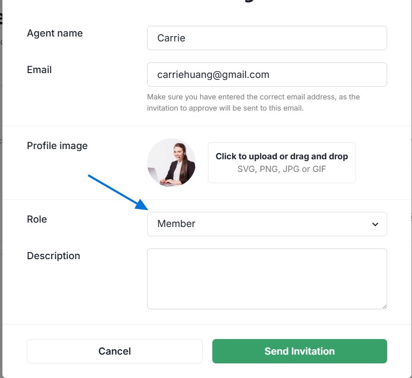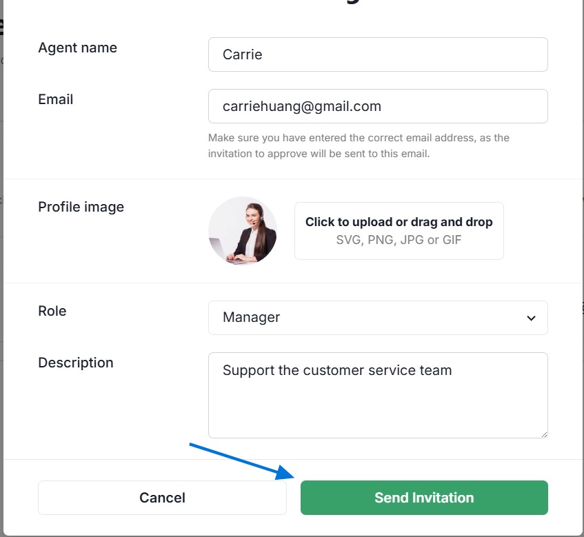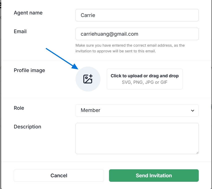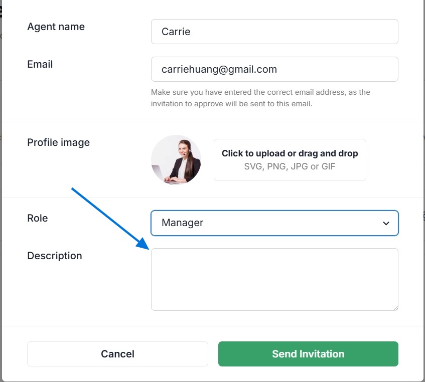 - Enter the agent's name and email address. Ensure the address is correct, as the agent will receive an invitation link via email to join the team.