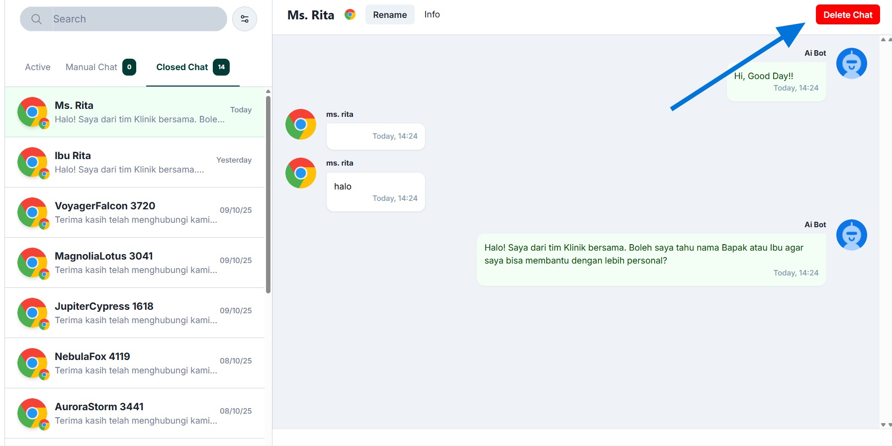 - In the “Closed Chat” tab, there is an option to delete the conversation.