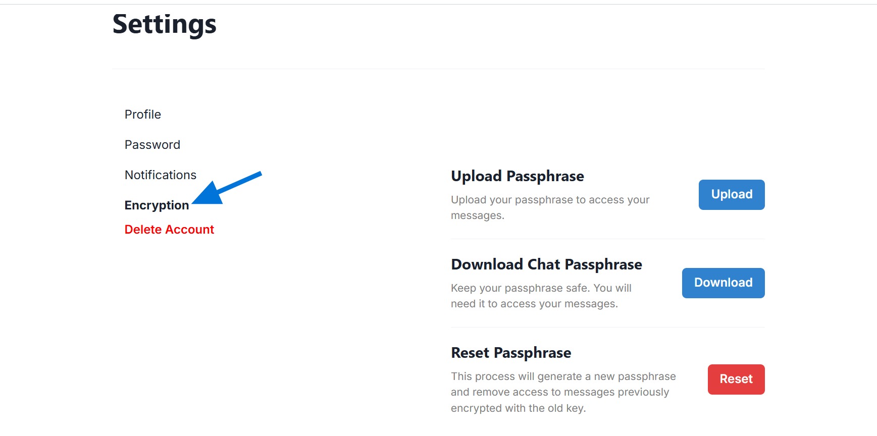 If the key is deleted — for example, if you clear your browser’s cache or session data — you can reset your passphrase on the Profile > Encryption page, then: