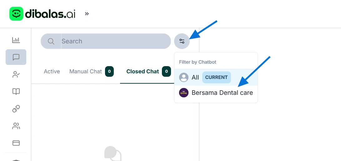 - To display the inbox based on a specific chatbot, you can click the filter icon and then select the name of the chatbot.