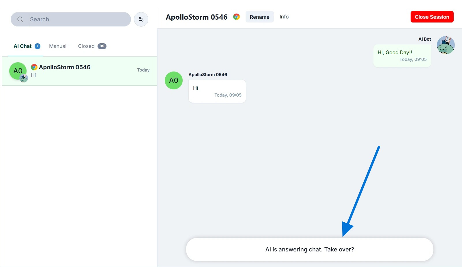 - You can press the 'Take Over' button to take over the conversation.