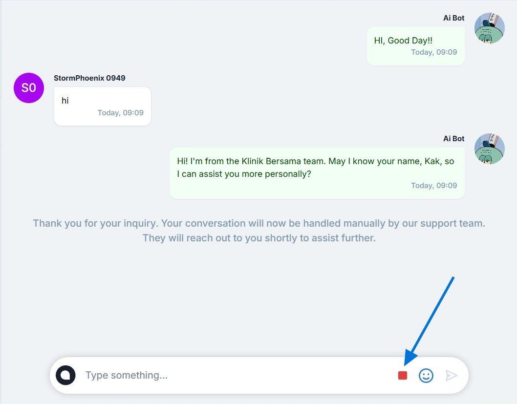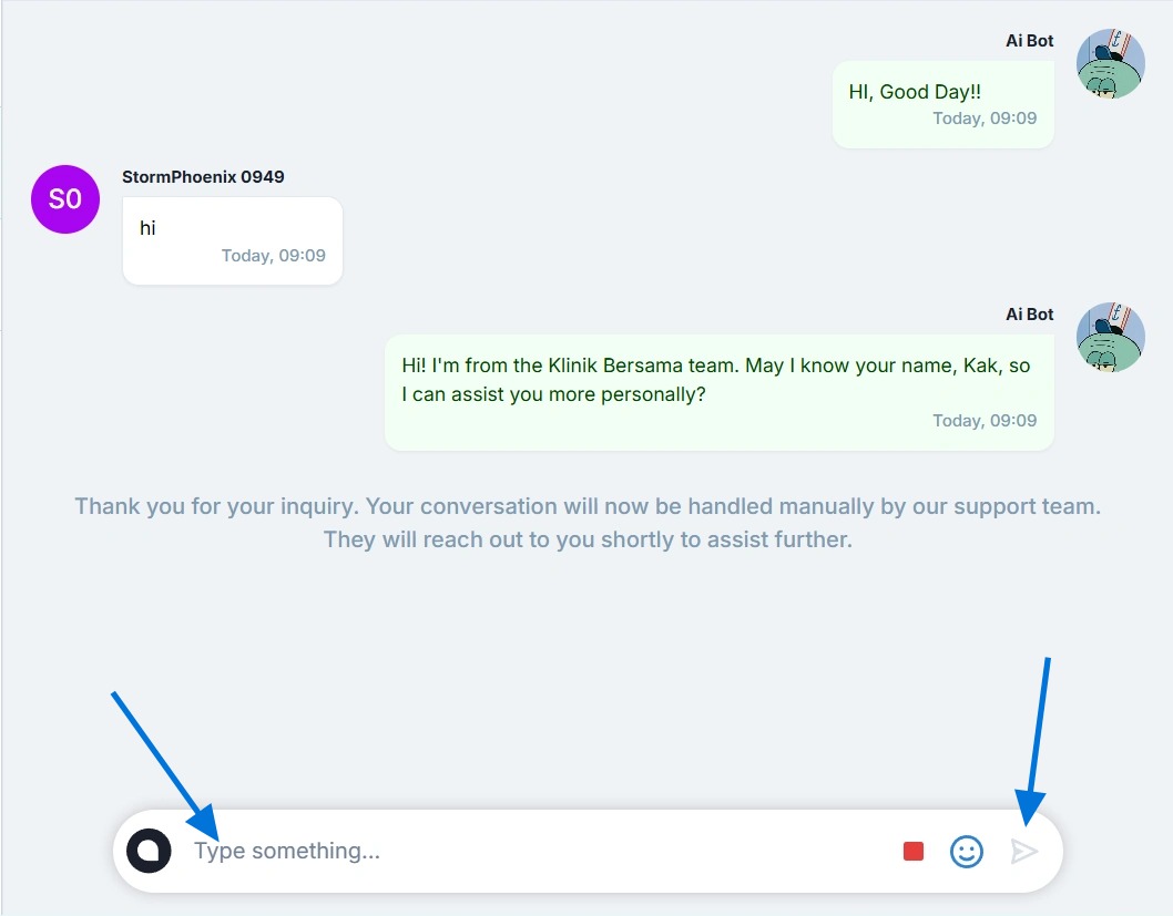 - After pressing the "Take over" button, a message writing field will appear, and the messages will move to the "Manual Chat" tab. You can send messages and emoticons to the customer.